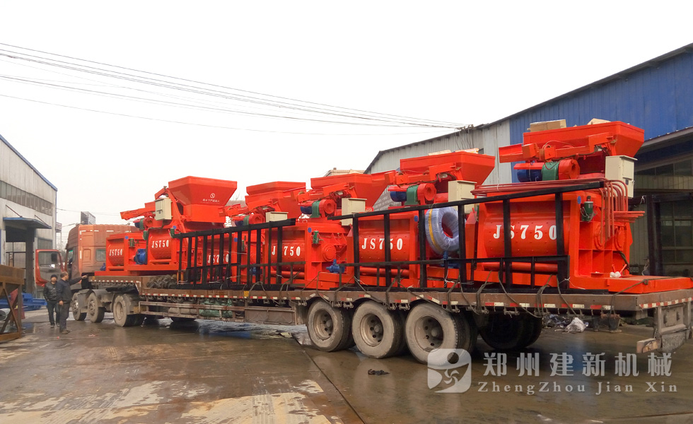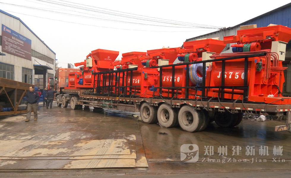 2015年12月1日,6臺JS750強制式混凝土攪拌機在鄭州建新機械廠家完成裝車,發往河南周口。